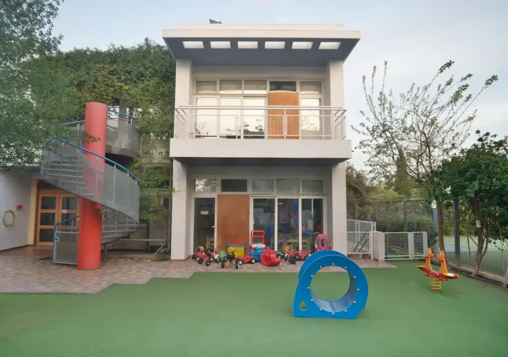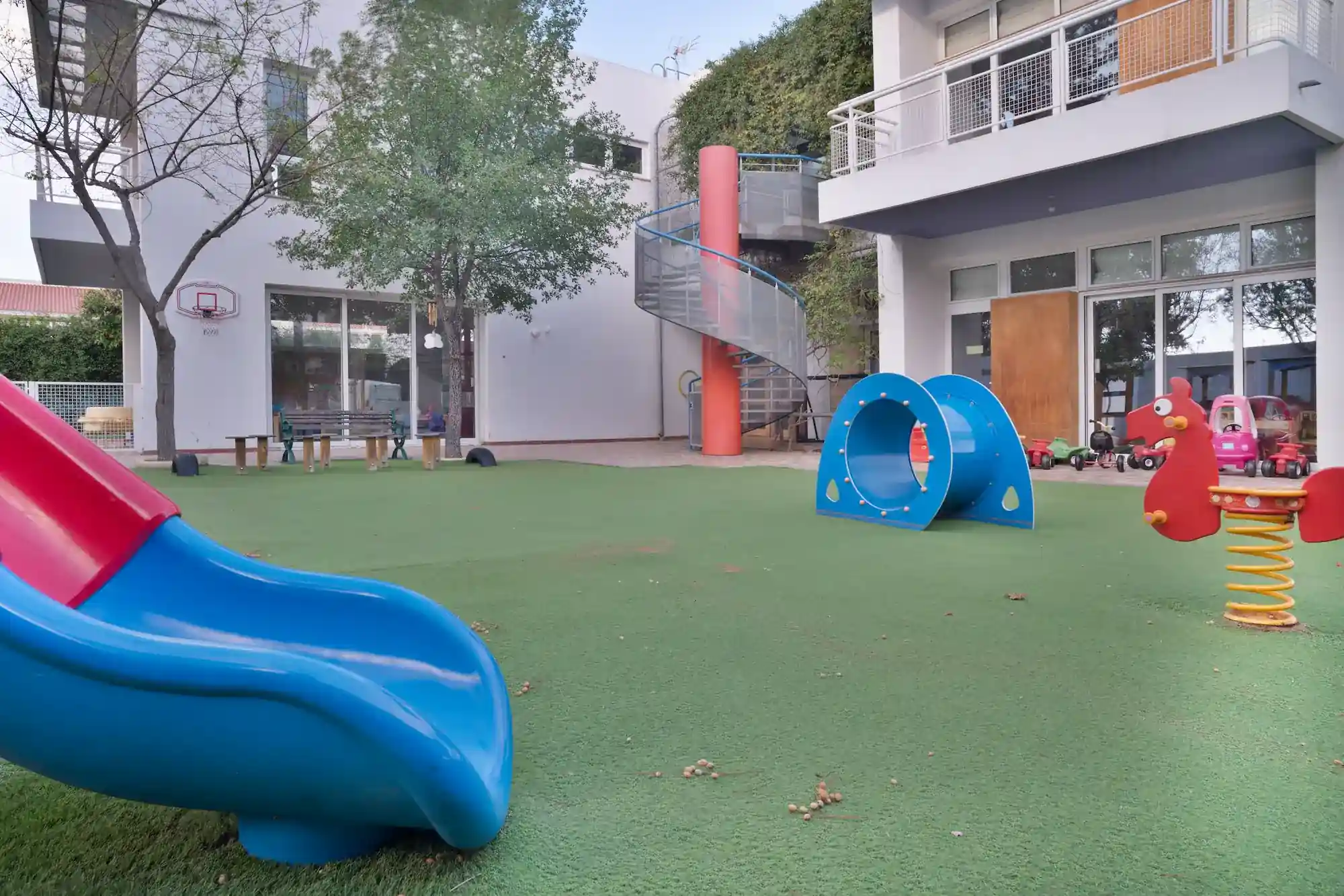 Το κτίριο, σε σχήμα Γ, αγκαλιάζει την εσωτερική αυλή, όπου τα παιδιά παίζουν με ασφάλεια. Εκεί υπάρχει τσουλήθρα, τραμπάλες, τρενάκι, σπιτάκι, χώρος με πετραδάκια και αμμοδόχος. Τα παιδιά παίζουν επίσης με ποδηλατάκια και αυτοκινητάκια.
