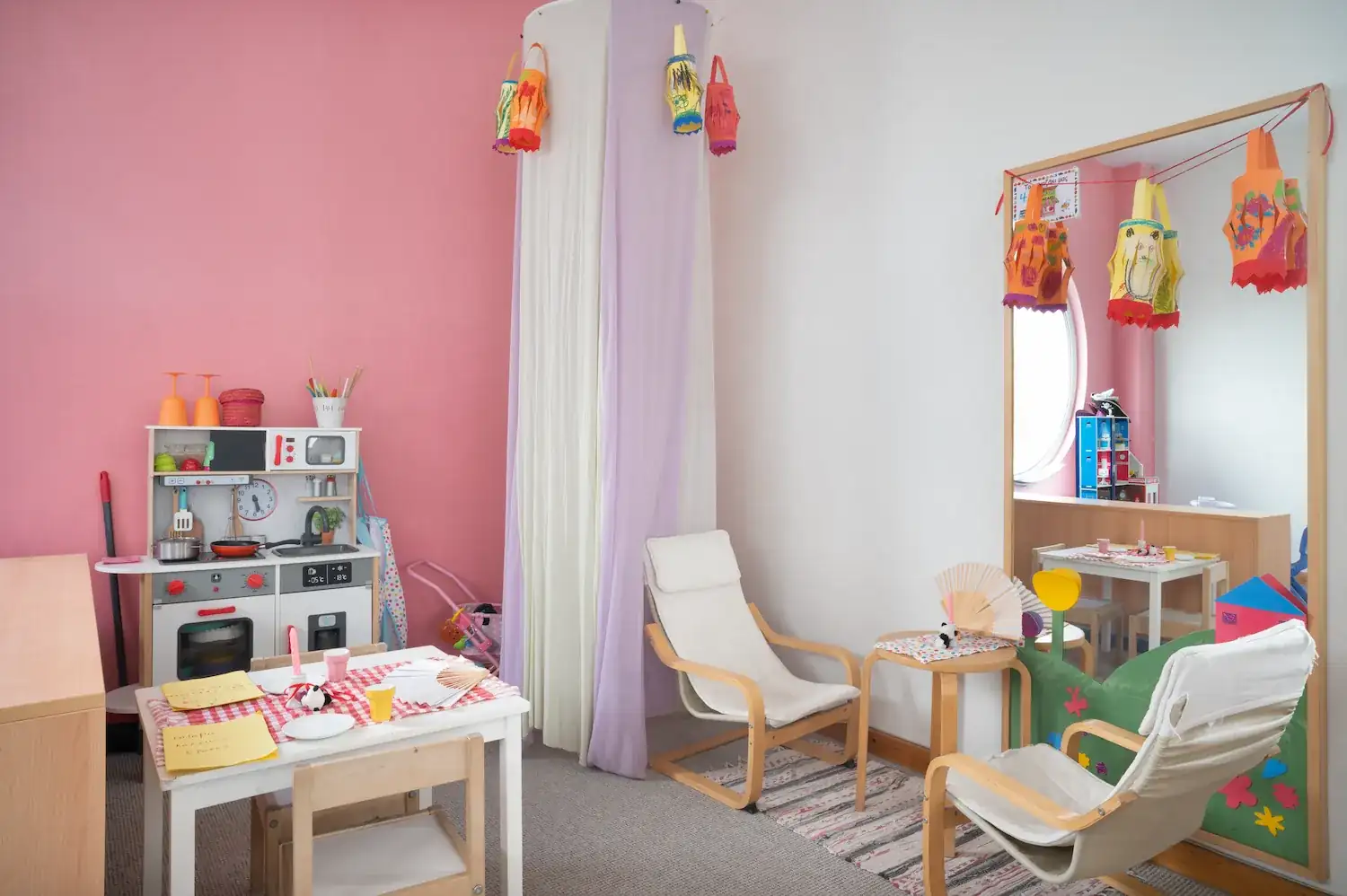 Για όλους τους χώρους έχουν επιλεγεί υλικά φιλικά για το περιβάλλον και τα παιδιά: δάπεδο λινόλεουμ, οικολογικές μπογιές και βερνίκια για τις ξύλινες επιφάνειες και έχουν αποφευχθεί τα τοξικά υλικά.
